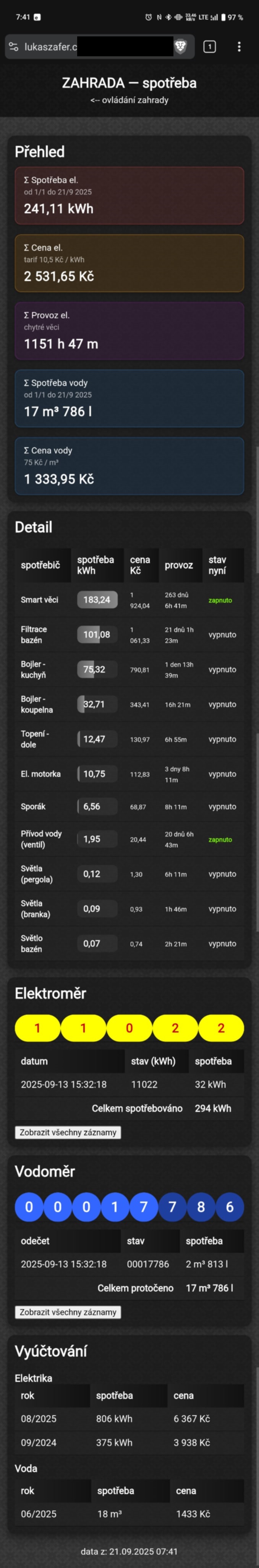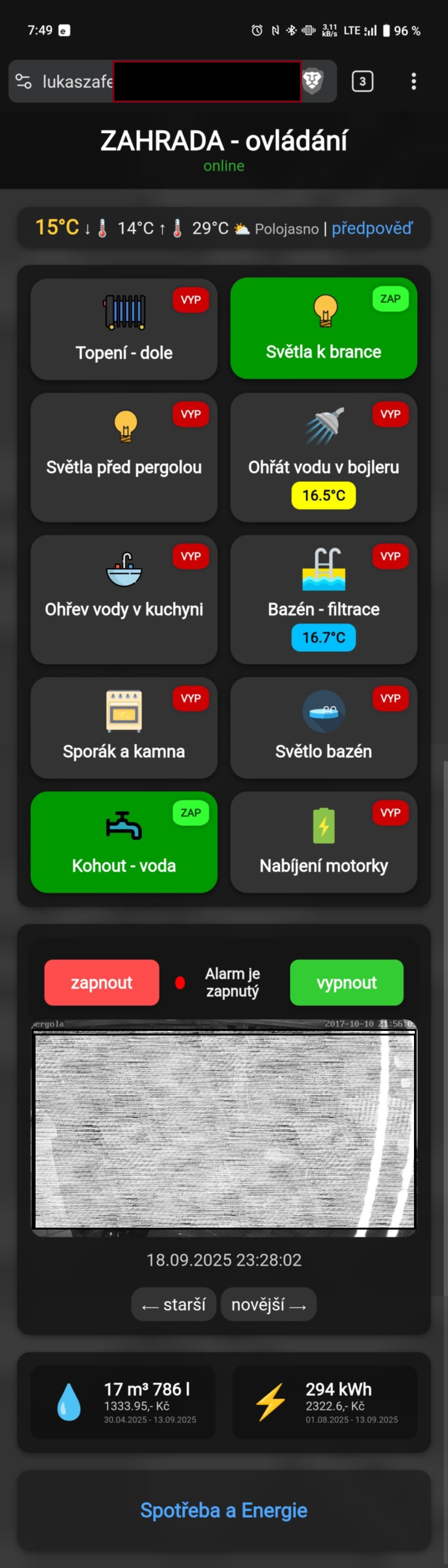 Vylepšil jsem ovládání a vizuální vzhled mé chytré domácnosti. Před zobrazením stránky se spouští tři dotazy: získej aktuální čas, pomocí post požadavku ověř, zda jsou zařízení připojené k wifi a internetu a stáhni hodnoty venkovní teploty ze senzoru. Ovládací část je vytvořena pomocí přepínatelného inputu, v budoucnu bude nějaký pěkný toggle switch. Všechny inputy resp. checkboxy si ověřují aktuální stavy zařízení. Přidal jsem i další kontejner chytré scény, které umí o trochu více než jen zapnout a vypnout. Testuji i další sekci - alarm s kamerou. Jedná se o dvě různé zařízení. Při jakémkoliv pohybu, ať kočky či pavouka před kamerou se tento snímek okamžitě nahraje na FTP. Pomocí scriptu si nechám na stránce vypsat čas a snímek poslední detekce. Alarm pomocí odkazu ahref="sms:XX... fyzických kontaktů, které mimochodem dokáží alarm aktivovat či deaktivovat nyní je možné ovládat skrze stránku a relé sonoff, a to celé bez potřeby číselné klávesnice, SMS a RF ovladače. Přeškrnuté jsou zařízení, které v zimním období jsou odpojená, zejména kvůli jejich nevyužití.