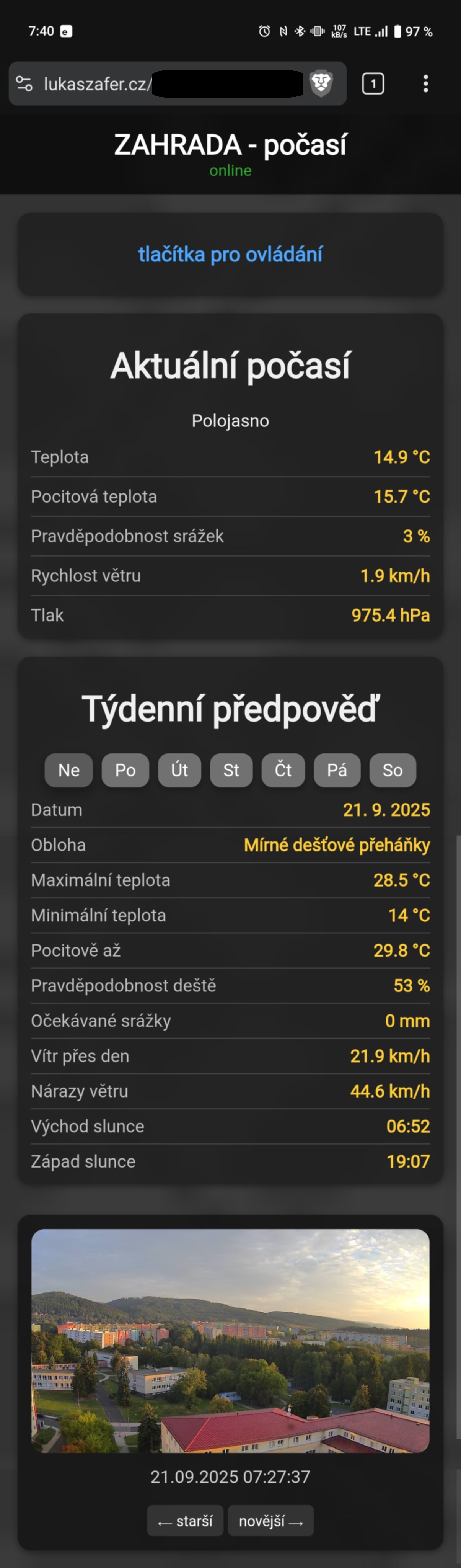 Vzhledem k tomu, že jsem nechtěl, aby všichni členové rodiny museli složitě stahovat aplikaci a ovládat zařízení pomocí komplikovaných metod, vytvořil jsem webovou stránku s několika tlačítky. Každé tlačítko je přiřazeno k jednotlivým příkazům, které se odešlou a provedou po stisknutí. Tímto způsobem mohou jednoduše ovládat jednotlivá zařízení pomocí webové stránky bez nutnosti složitého nastavování. Pro úplné zjednodušení jsem uložil odkaz na webovou stránku přímo na plochu chytrého telefonu. Stačí kliknout na ikonu, vybrat příslušné zařízení a kliknout na příkaz, který chceme provést. Tímto jednoduchým procesem lze snadno ovládat zařízení pomocí webové stránky, aniž by bylo potřeba složitého nastavování nebo stahování aplikace.Ovládání - zahrada