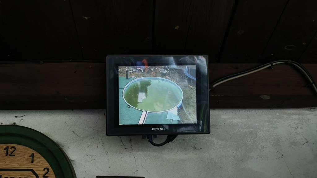 Často sedíme pod pergolou, odkud je výhled na bazén omezený a není možné ho mít přímo na očích. Proto jsem využil starší analogovou kameru připojenou k monitoru, díky čemuž můžeme sledovat, co se děje kolem i přímo v bazénu. Stačí jen sledovat monitor. Do budoucna možná přidám k bazénu pohybové (př. radarové) čidlo a zábleskové světlo, aby se vynutil právě pohled na monitor nebo rovnou na bazén.